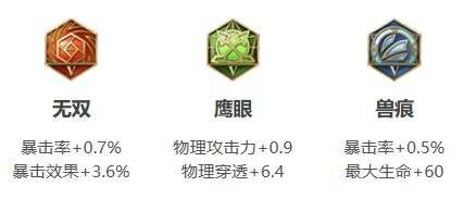 2、铭文思路:伽罗是非常吃暴击效果的一个英雄,所以装备无双和兽痕,鹰眼增加攻击力及穿透。