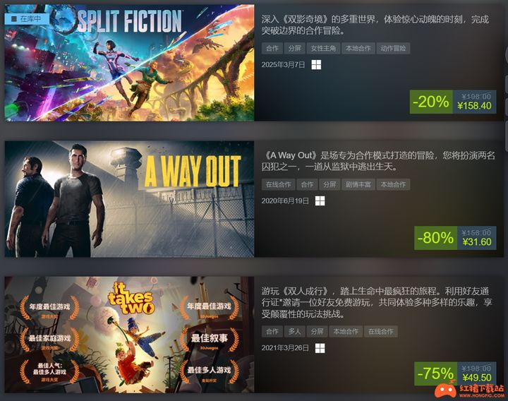 大促期间,另外两款来自 Hazelight 工作室的优秀合作游戏也将参与促销! 即刻购买《逃出生天》立享二折优惠,你将扮演一名囚犯,与另一名囚犯一起逃出监狱。一开始紧张刺激的越狱计划,却转瞬间发生出人意料的转折,带来一段前所未见、情感交织而难以捉摸的冒险。 即刻购买《双人成行》立享二五折优惠,踏上专为二人合作游玩打造的疯狂之旅。你们将扮演科迪和小梅携手闯关,在每个新关卡中掌握独特且彼此关联的角色技能。